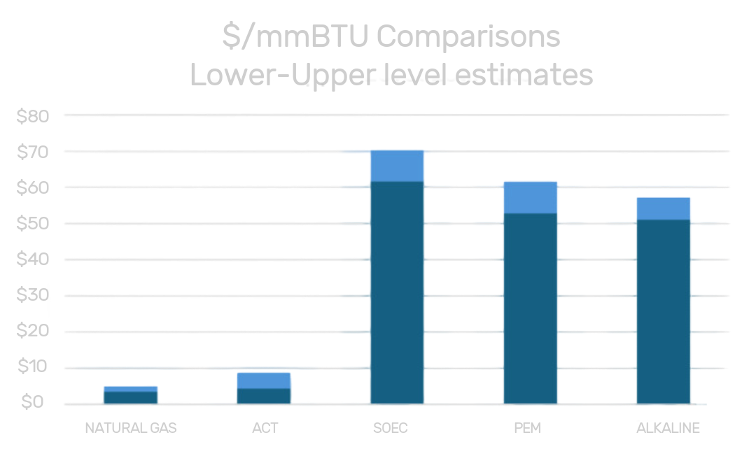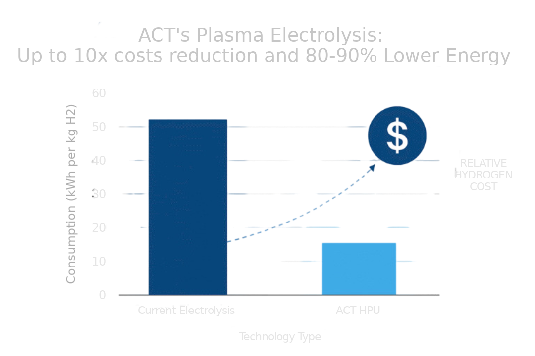 ACT’s patented plasma electrolysis technology has unlocked exceptional efficiencies to produce green hydrogen on par with natural gas.